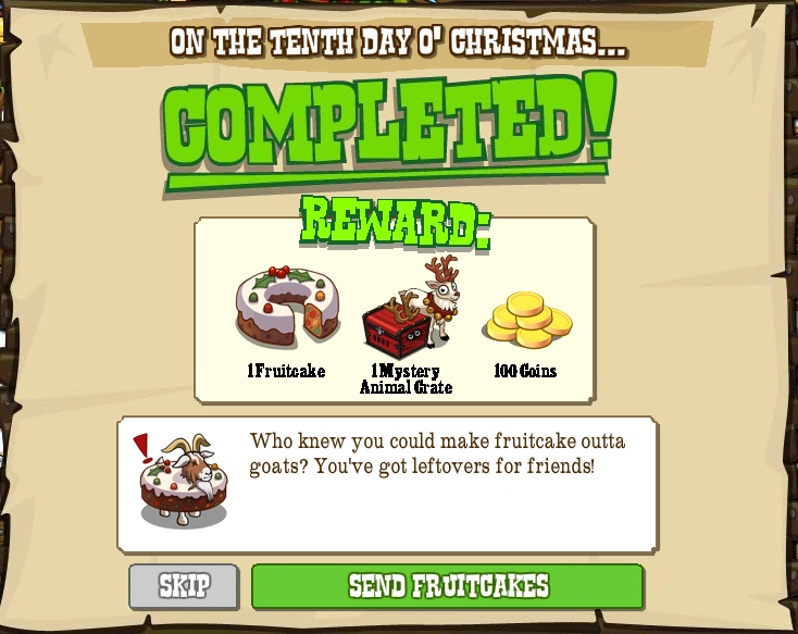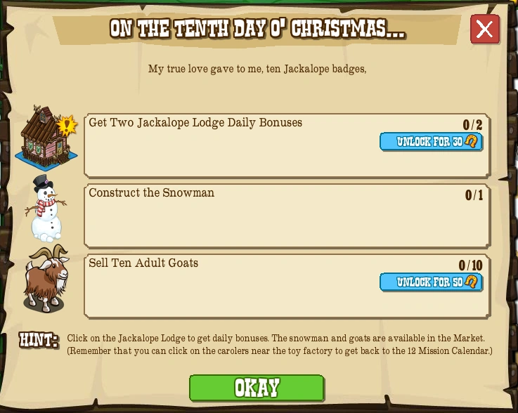 —Image © Zynga Goal Information Description My true love gave to me, ten Jackalope badges, In-Game Hint Click on the Jackalope Lodge to get daily bonuses. The snowman and goats are available in the Market. (Remember that you can click on the carolers near the toy factory to get back to the 12 Mission Calendar.) Rewards Coins 100 Coins Item 1 Fruitcake , 1 Mystery Reindeer Crate Sharing Bonus Item 1 Fruitcake Goals