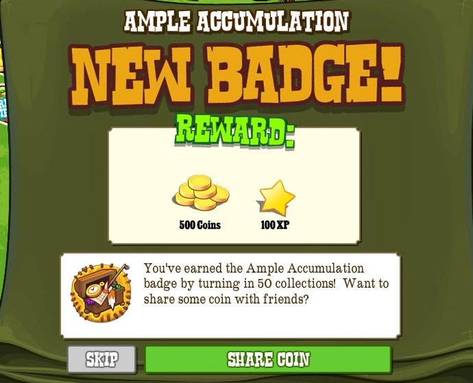 The Ample Accumulation Badge is one of the Badges in FrontierVille. It is earned by turning in 50 Collections. It was released on September 22nd, 2010.