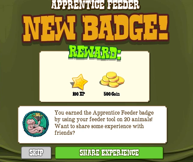 Pioneer fed 20 Animals with the Feeder and has earned the Apprentice Feeder badge! Pioneer wants to share some XP with everyone! |