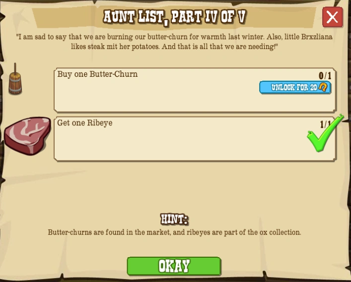 Butter-churns are found in the market, and ribeyes are part of the ox collection.