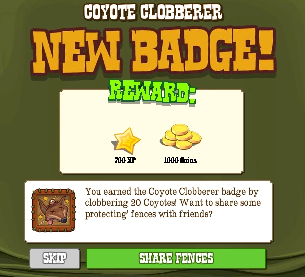 The Coyote Clobberer Badge is one of the Badges in FrontierVille. It is earned by clobbering 20 Coyotes. It was released on March 11th, 2011.