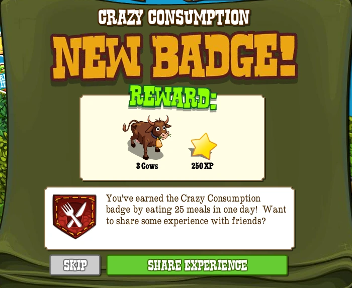 The Crazy Consumption Badge is one of the Badges in FrontierVille. It is earned by eating 25 Meals in one day. It was released on September 22nd, 2010.