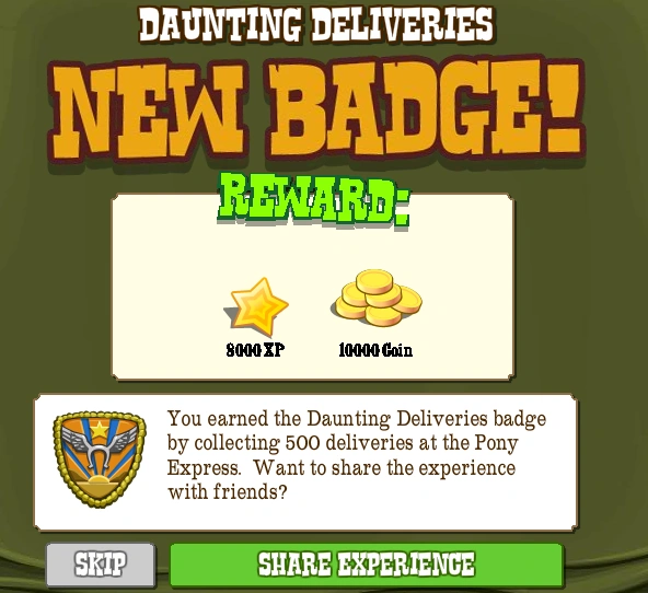 The Daunting Delivery Badge is one of the Badges in FrontierVille. It is earned by collecting 500 deliveries from the Pony Express. It was released on February 2nd, 2011.