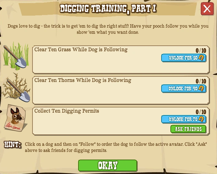 | In-Game Hint | Click on a dog and then "Follow" to order the dog to follow the active avatar. Click "ask" above to ask friends for digging permits. |