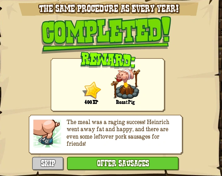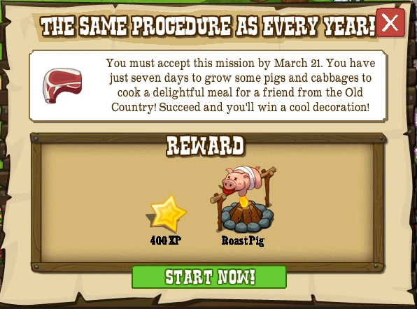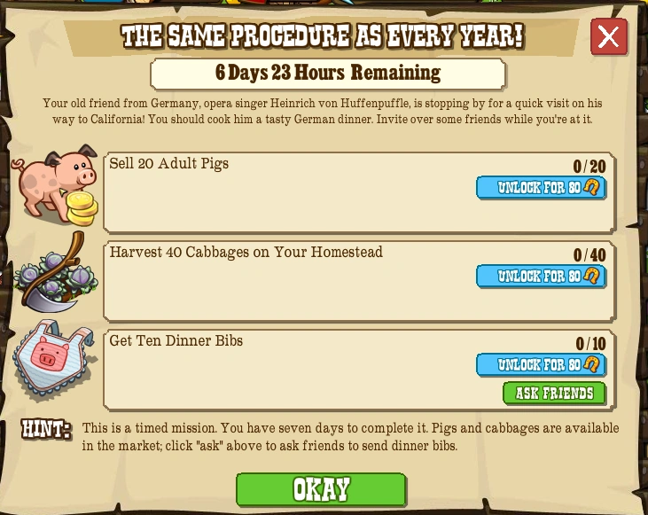 | In-Game Hint | This is a timed mission. You have seven days to complete it. Pigs and cabbages are available in the market; click "ask" above to ask friends to send dinner bibs. | |||