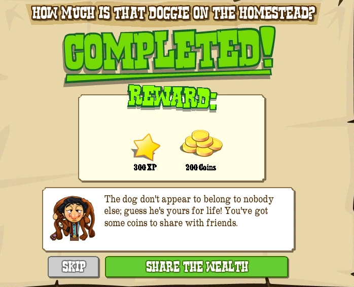 Pioneer has rescued a dog on the homestead and is nursing the critter back to health. Pioneer has some leftover coins for friends.