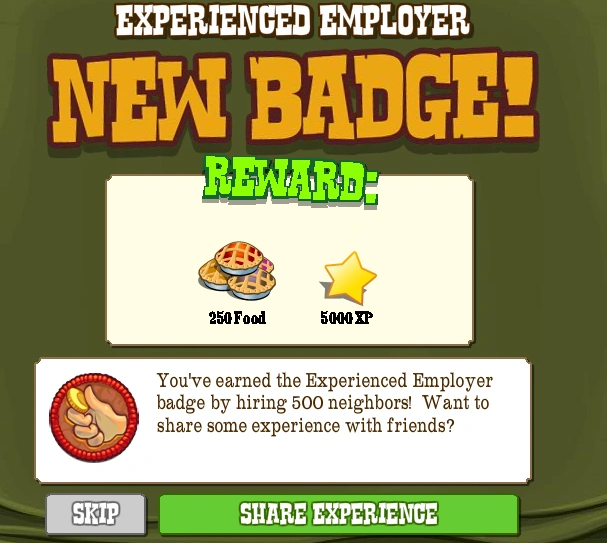 The Experienced Employer Badge is one of the Badges in FrontierVille. It is earned by hiring 500 Neighbors. It was released on September 22nd, 2010.