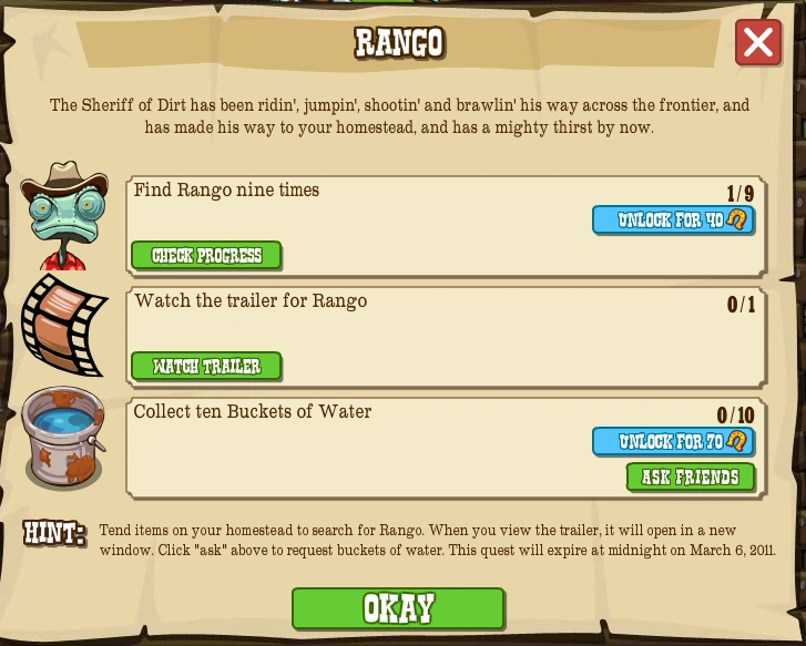 | In-Game Hint | Tend items on your homestead to search for Rango. When you view the trailer, it will open in a new window. Click "ask" above to requests buckets of water. This quest will expire at midnight on March 6th, 2011. |