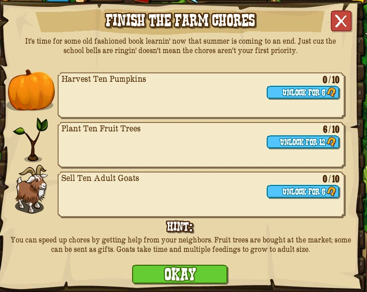 You can speed up the chores by getting help from your neighbors. Fruit trees are bought at the market; some can be sent as gifts. Goats take time and multiple feedings to grow to adult size.