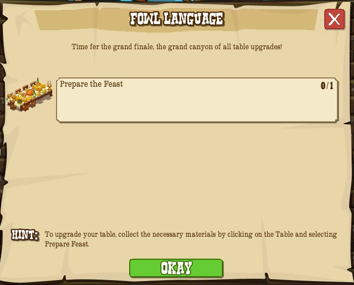 | In-Game Hint | To upgrade your table, collect the necessary materials by clicking on the table table and selecting prepare feast. |