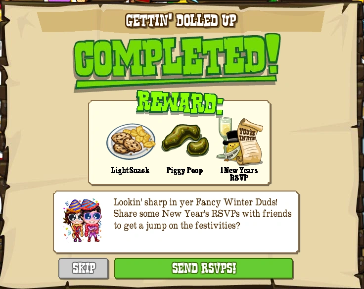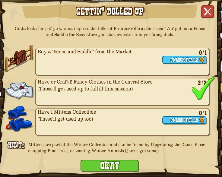 Gotta look sharp if ye wanna impress the folks of FrontierVille at the social! An' put out a Fence and Saddle for Bess 'afore you start sweatin' into yer fancy duds.