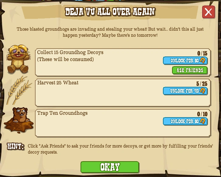 | Description | Those blasted groundhogs are invading and stealing your wheat! But wait... didn't this all just happen yesterday? Maybe there's no tomorrow! |