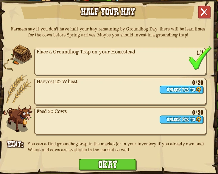 You can a find groundhog trap in the market (or in your inventory if you already own one). Wheat and cows are available in the market as well.