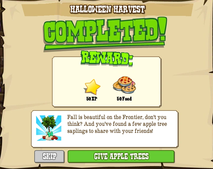 Halloween Harvest is one of the Limited Edition Goals in FrontierVille. It was the first part in the Trick or Treat! Goal Series. It was released on October 21st, 2010 and expired on November 7th, 2010.