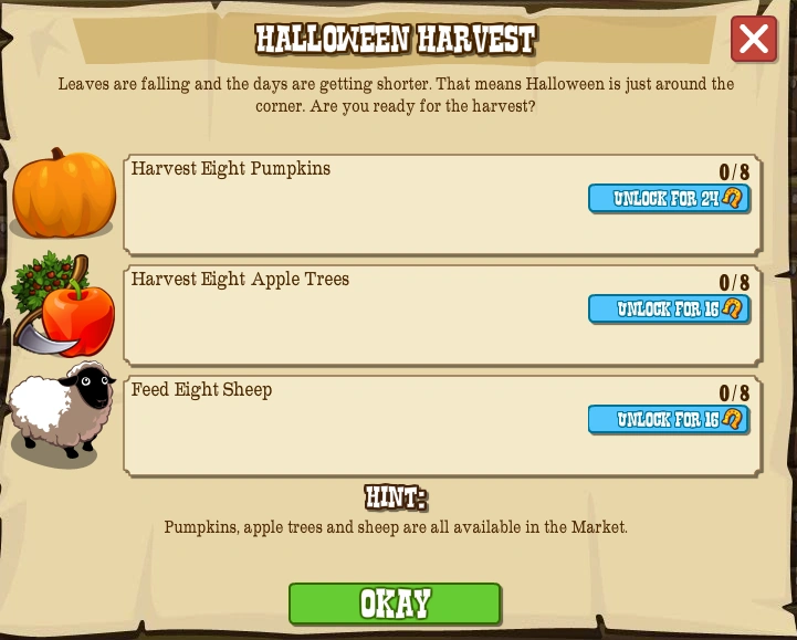 | In-Game Hint | Pumpkins, apple trees and sheep are all available in the Market. |