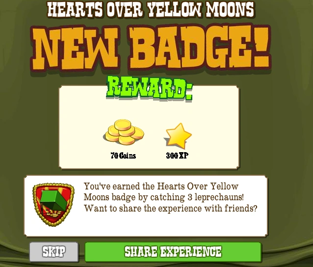 The Hearts Over Yellow Moons Badge is one of the Badges in FrontierVille. It is earned by catching 3 Leprechauns. It was released on March 15th, 2011.