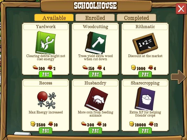 Lessons can be learned in the School House after completing the Finding the Perfect Apple Goal. Each Lesson gives a different permanent bonus. Starting each Lesson costs Food or Coins, and Ribbons. Completing the Lesson costs sets of School Supplies (consisting of the Chalk, Ink Pen, Ink Well, Slate, and Spitball), which are obtained as Gifts from Neighbors. School Supplies may be requested from Neighbors via the "Enrolled" tab in the School House. There are currently 12 Lessons and 3 Limited edition Lessons in FrontierVille.