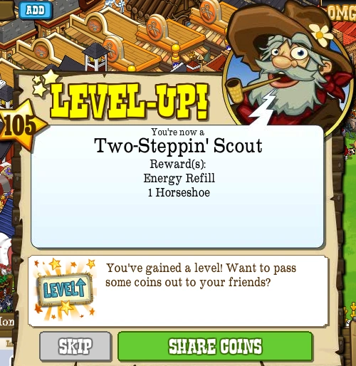 Level 105, also known as the Two-Steppin' Scout, is the one-hundred and fifth Level that the Pioneer can advance to in FrontierVille. It takes