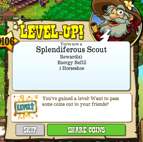 Level 106, also known as the Splendiferous Scout, is the one-hundred and sixth Level that the Pioneer can advance to in FrontierVille. It takes