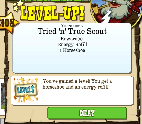 Level 108, also known as the Tried 'n' True Scout, is the one-hundred and eighth Level that the Pioneer can advance to in FrontierVille. It takes