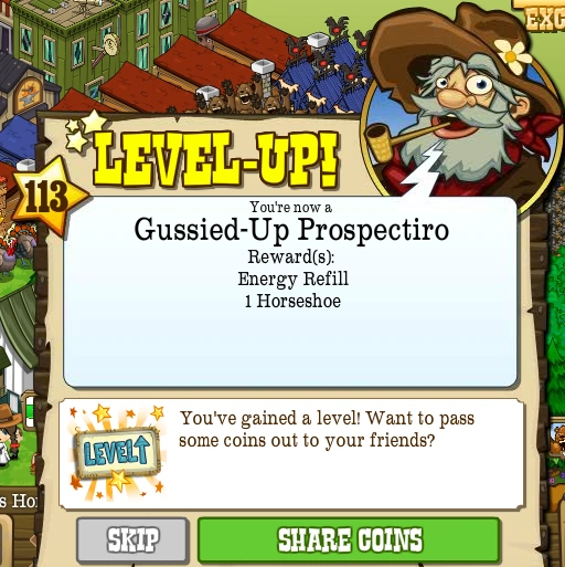 Level 113, also known as the Gussied-Up Prospectiro, is the one-hundred and thirteenth Level that the Pioneer can advance to in FrontierVille. It takes