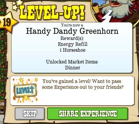 Level 19, also known as the Handy Dandy Greenhorn, is the nineteenth Level that the Pioneer can advance to in FrontierVille. It takes