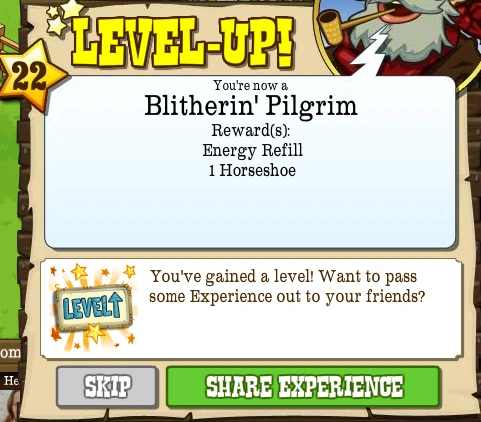 Level 22, also known as the Blitherin' Pilgrim, is the twenty-second Level that the Pioneer can advance to in FrontierVille. It takes