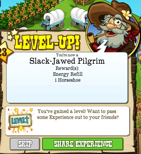 Level 23, also known as the Slack-Jawed Pilgrim, is the twenty-third Level that the Pioneer can advance to in FrontierVille. It takes