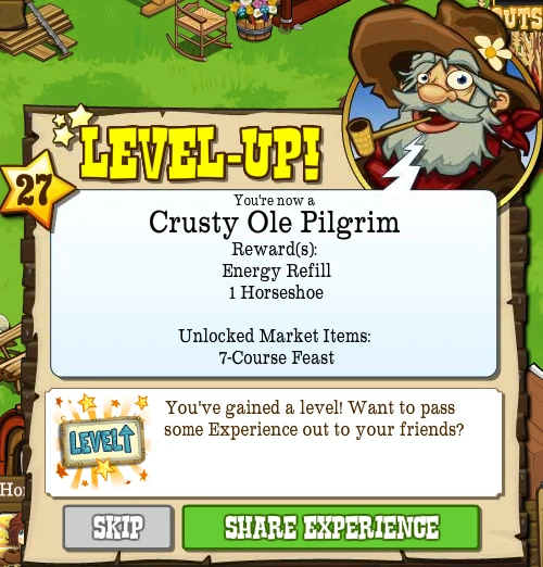Level 27, also known as the Crusty Ole Pilgrim, is the twenty-seventh Level that the Pioneer can advance to in FrontierVille. It takes