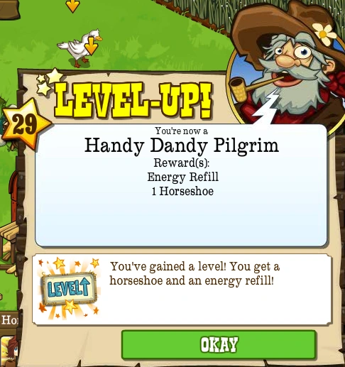 Level 29, also known as the Handy Dandy Pilgrim, is the twenty-ninth Level that the Pioneer can advance to in FrontierVille. It takes
