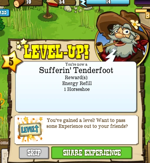 Level 5, also known as the Sufferin' Tenderfoot, is the fifth Level that the Pioneer can advance to in FrontierVille. It takes