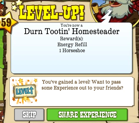 Level 59, also known as the Durn Tootin' Homesteader, is the fifty-ninth Level that the Pioneer can advance to in FrontierVille. It takes