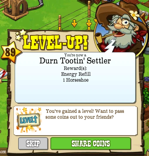 Level 89, also known as the Durn Tootin' Settler, is the eighty-ninth Level that the Pioneer can advance to in FrontierVille. It takes