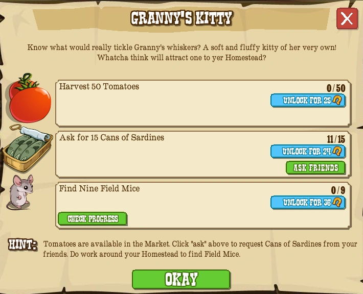 Tomatoes are available in the Market. Click "ask" above to request Cans of Sardines from your friends. Do work around your Homestead to find Field Mice.