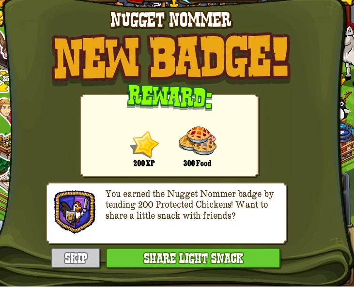 The Nugget Nommer Badge is one of the Badges in FrontierVille. It is earned by tending 200 Protected Chickens. It was released on March 11th, 2011.