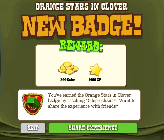 The Orange Stars in Clover Badge is one of the Badges in FrontierVille. It is earned by catching 10 Leprechauns. It was released on March 15th, 2011.