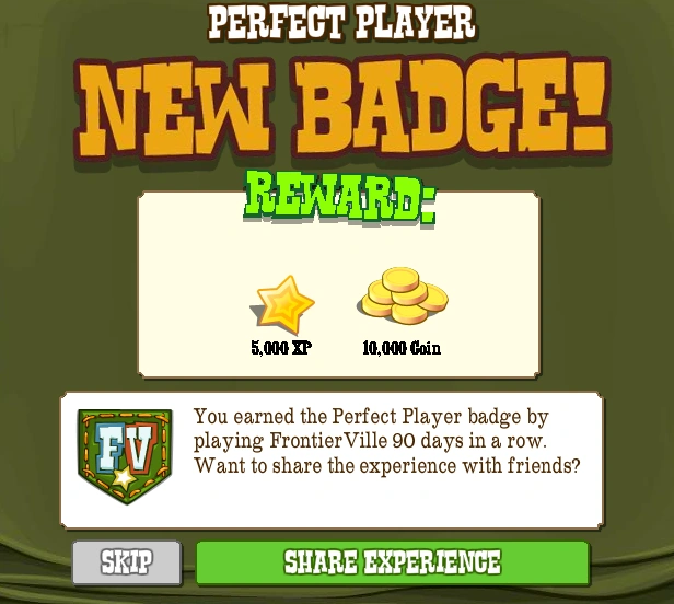 The Perfect Player Badge is one of the Badges in FrontierVille. It is earned by playing for 90 days in a row. It was released on January 7th, 2011.