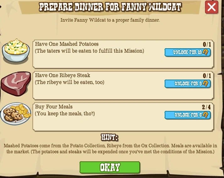 | In-Game Hint | Mashed Potatoes come from the Potato Collection, Ribeye from the Ox Collection. Meals are available in the market. |