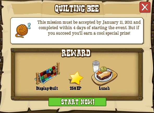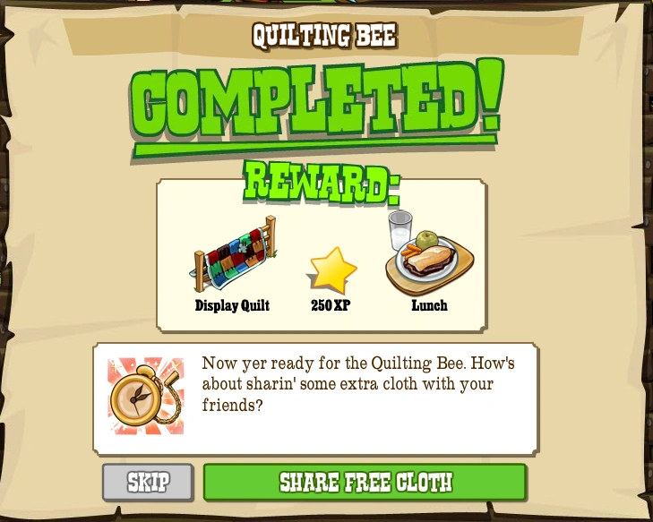 Quilting Bee was one of the Timed Goals in FrontierVille. It was released on December 17th, 2010. It needed to be accepted by January 11th, 2011 and the Pioneer had 4 days after accepting to complete it.