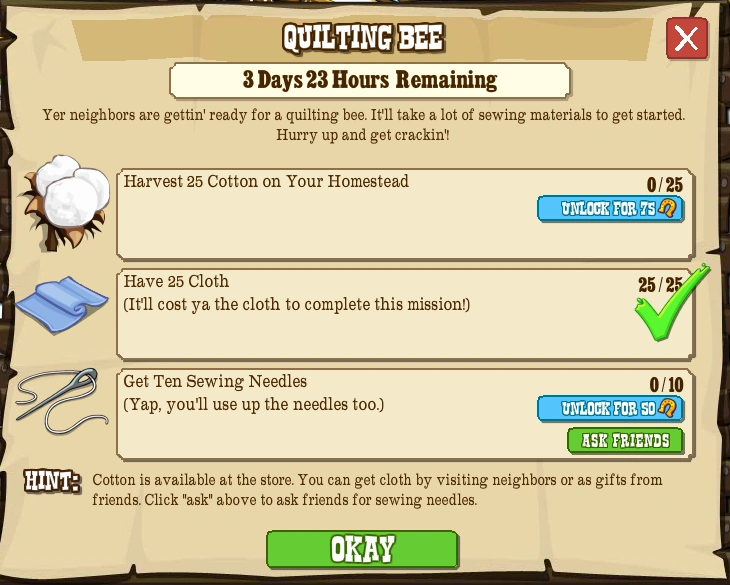 | In-Game Hint | Cotton is available at the store. You can get cloth by visiting neighbors or as gifts from friends. Click "ask" above to ask for sewing needles. |