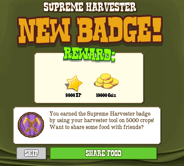 The Supreme Harvester Badge is one of the Badges in FrontierVille. It is earned by harvesting 5,000 Crops with the Harvester. It was released on March 9th, 2011.