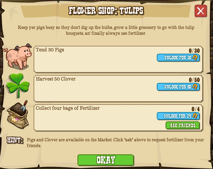 | In-Game Hint | Pigs and Clover are available on the Market. Click "ask" above to request fertilizer from your friends. |