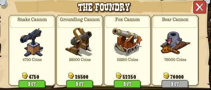 Varmint Cannon is one of the Goals in FrontierVille which was announced on August 27th, 2010. The Varmint Cannon is a Goal with five parts. Accomplishing all the parts of this goal will reward the Pioneer with a the ability to purchase and build the Foundry. The quest is started by buying the Varmint Cannon Mission at the Market.