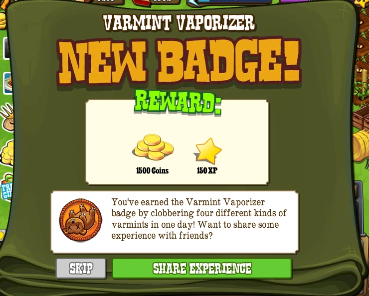The Varmint Vaporizer Badge is one of the Badges in FrontierVille. It is earned by clobbering 4 types of Varmints in 1 day. It was released on September 22nd, 2010.